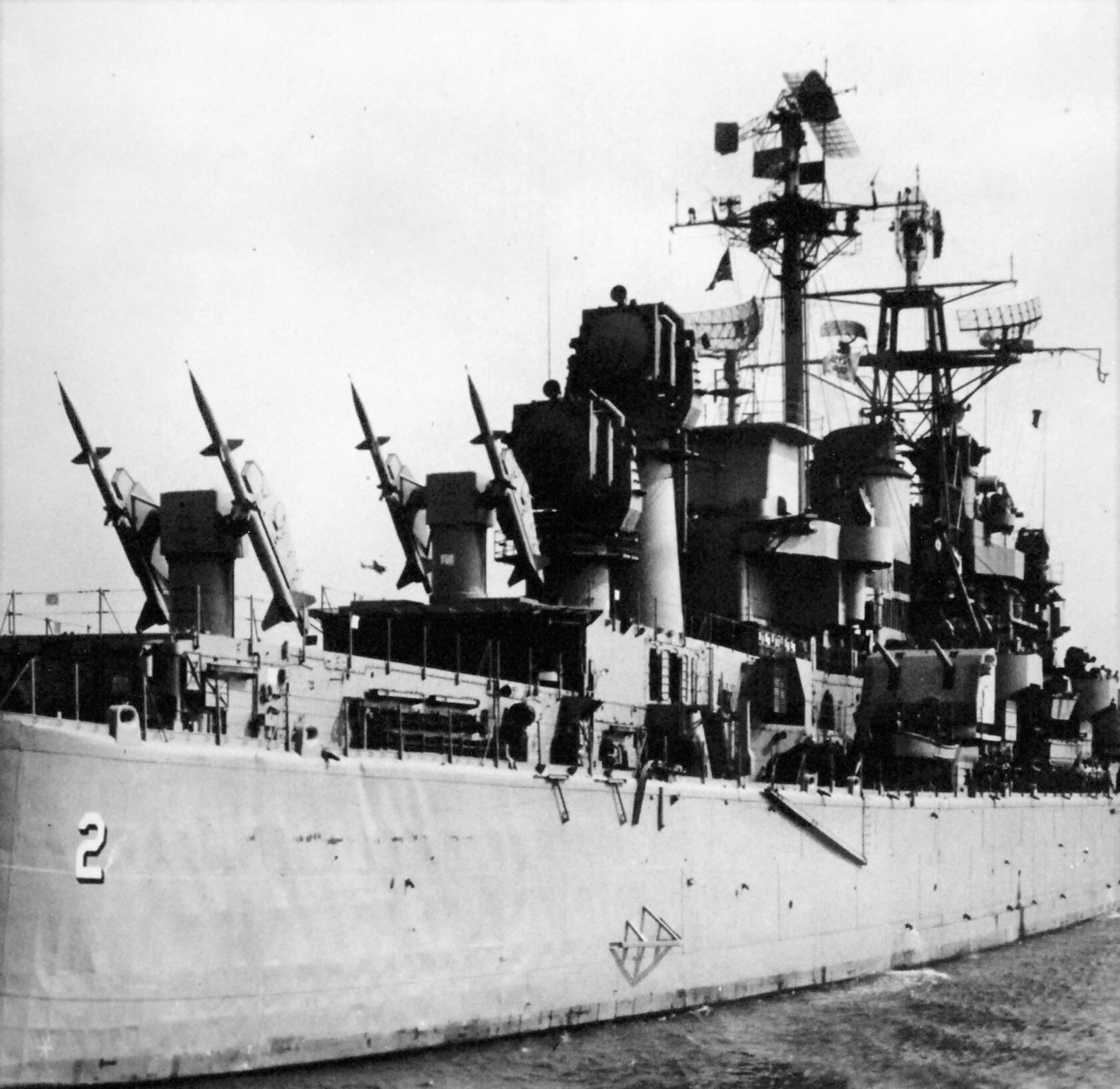 Official period caption: “Super radars (AN/SPQ5) for guidance on terrier missiles installed on board USS Canberra (CAG-2). The radars have massive, turret-like antennae and resemble giant searchlights. Developed for the U.S. Navy by the Sperry Gyroscope Company, the long range, high-altitude missile guidance systems are a part of the U.S. Navy’s program directed toward the fleet with highly reliable missiles to combat supersonic jet aircraft. The super radar is giving exceptionally high performance for tenacious stable guidance of supersonic missiles whether fired singly or in salvoes at individual or multiple enemy attackers. The systems combine many automatic radar functions in each unit and either system can control the missiles from a single launcher or battery, which fires the terrier missile or both radars can track different target groups simultaneously. It also includes flexible modes of scanning the air space many miles beyond the horizon, providing the advantage of early warning. Thus, individual targets can be selected from close flying groups and tracked with great distances while the missiles are launched and guided with extreme accuracy.” USN Photograph 670326 released May 3, 1957.