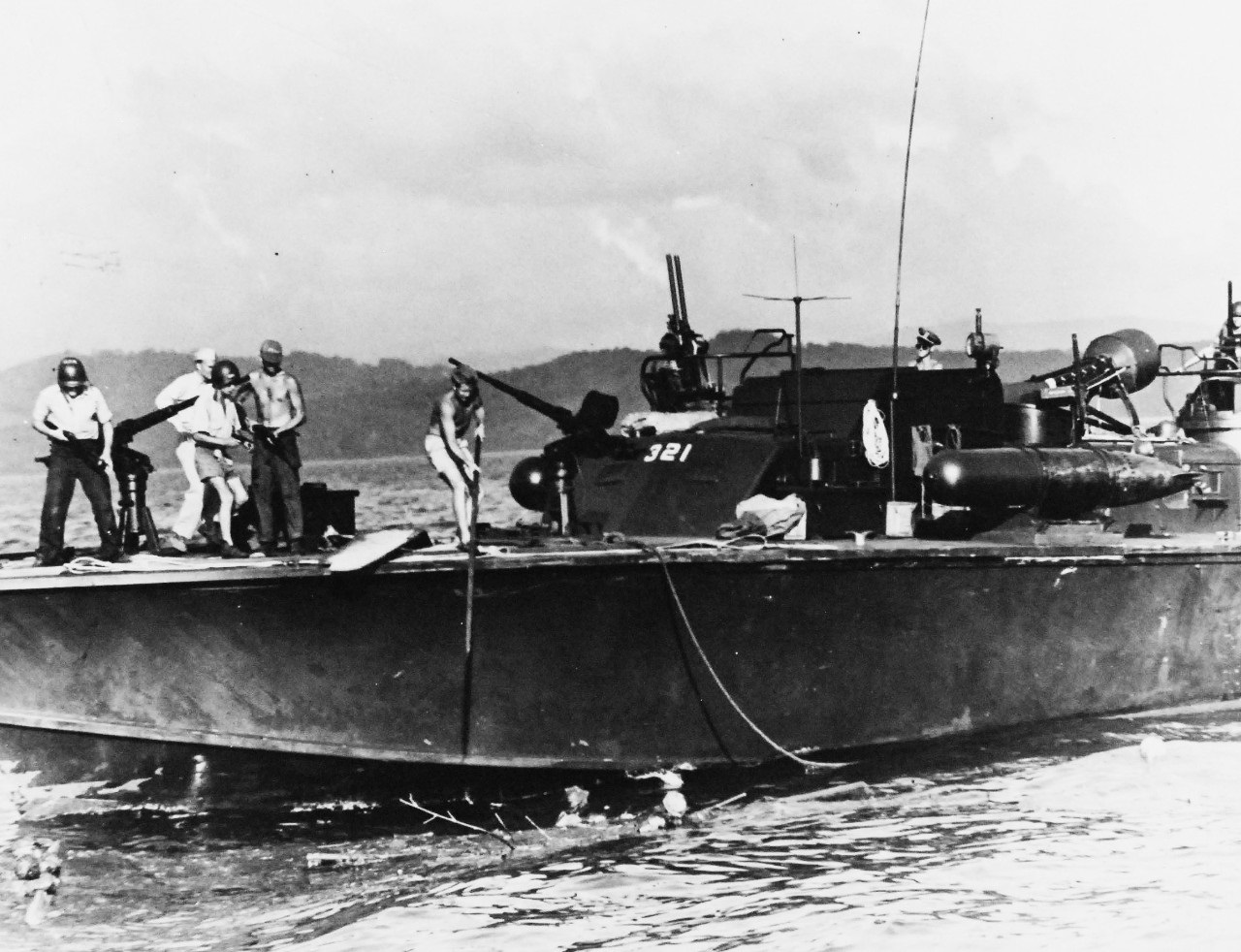 Battle of the Surigao Strait, October 1944. PT boats are active not only in spotting and attacking Japanese naval forces attempting to force Surigao Strait but also in picking up survivors. Japanese from naval craft, clinging to debris, approach a boat for rescue. PT Boat shown is “Death’s Hand” PT-321, of MTBRon 21, underway from Oyster Bay. 80-G-47001
