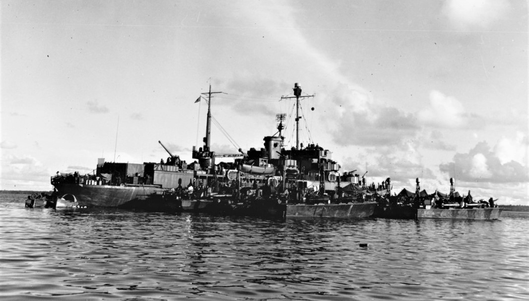 USS Oyster Bay (AGP-6) tending PT boats, likely of Squadrons 18 and 21, in Seeadler Harbor, Admiralty Islands, on 25 March 1944. Photograph from the Army Signal Corps Collection in the U.S. National Archives. Catalog #: SC 271592