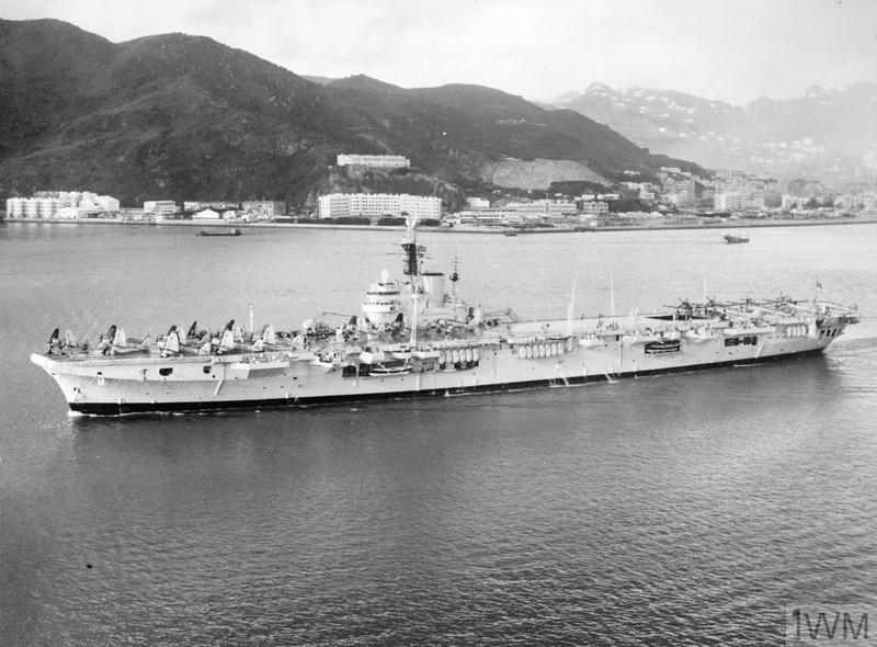 FAR EAST FLEET EXERCISES. 3 OCTOBER 1954, AERIAL PHOTOGRAPHS FROM AIRCRAFT OF THE LIGHT FLEET CARRIER HMS WARRIOR OF THE BRITISH FAR EAST FLEET. EXERCISES CARRIED OUT OFF THE CHINA COAST AND WITH THE ROYAL AUSTRALIAN NAVY. (A 33035) HMS WARRIOR sailing from Hong Kong for the exercises. Copyright: © IWM. Original Source: http://www.iwm.org.uk/collections/item/object/205016331