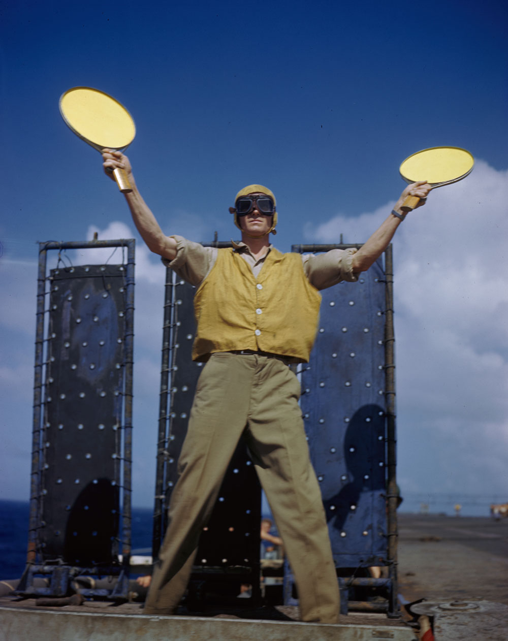 WO-A057319 Posted on June 1, 2021 by laststandonzombieisland Leave a comment Batsman on HMCS Warrior, signaling aircraft to land on the flight deck, circa 1946-48. LAC 4950874/WO-A057319 Previous Next Return to Warship Wednesday, June 2, 2021: Flattop of the Americas