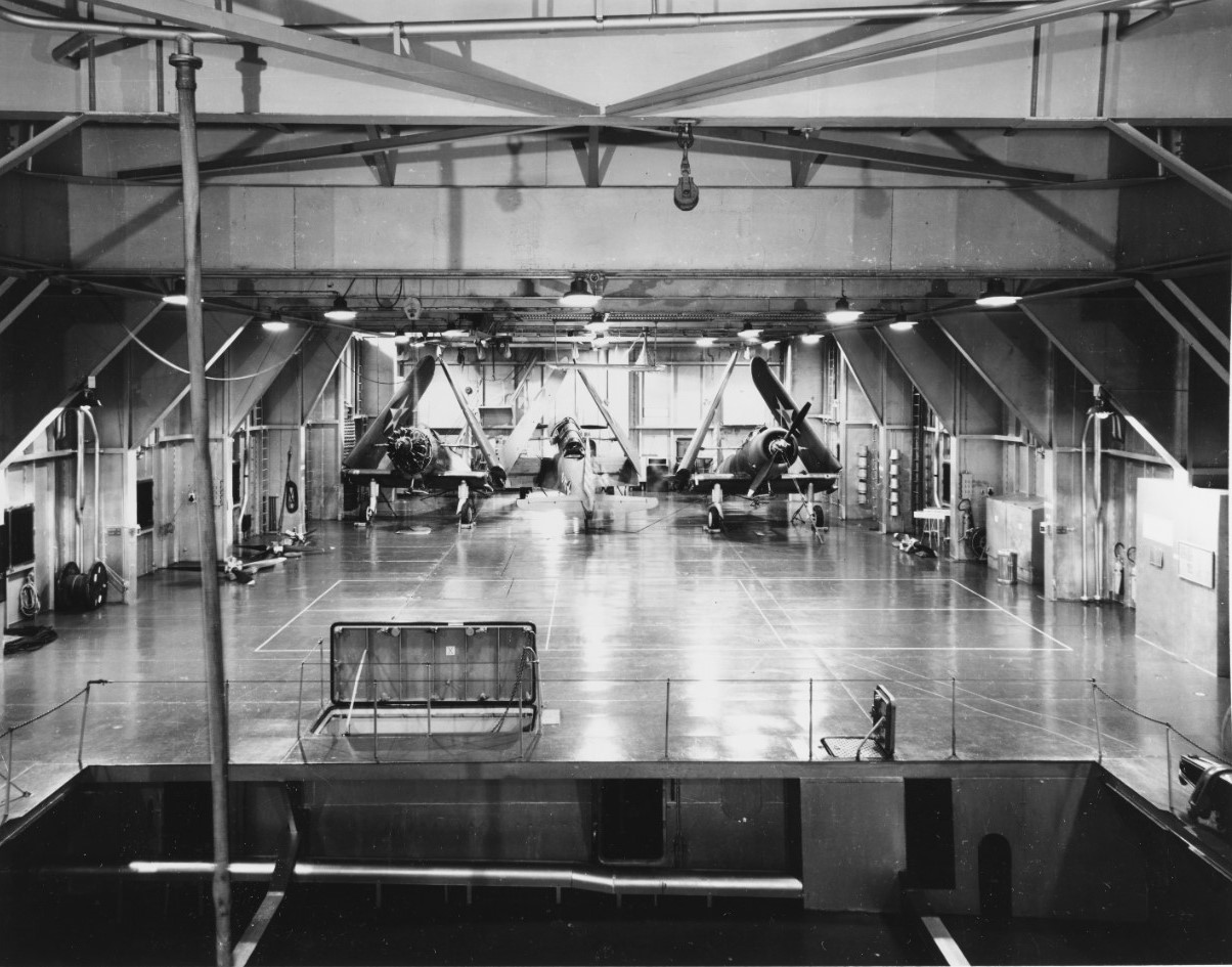 USS Long Island (AVG-1) View on the hangar deck, looking aft over the elevator pit, 28 March 1942. Three Vought SB2U scout bombers are present, embarked for carrier qualifications. Note propellers on deck, and cowling removed from the SB2U at left. The plane in center is marked S-75. 80-G-16967