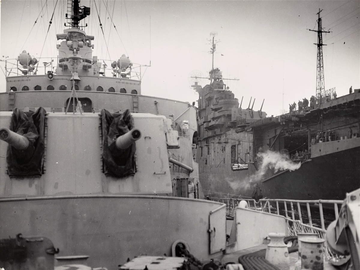 Original caption: Cargo being transferred from the USS Philippine Sea to the Coast Guard Ice-Breaking Cutter Northwind, on Operation Highjump, the Navy’s venture of exploration to the Antarctic. The Coast Guard Ice-Breaker has the task of opening lanes through heavy ice when other vessels with thinner plating could not force their way through. NARA 26-G-5062