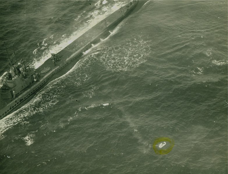 USS Spikefish (SS-404) rescues Ens. Cullen (in the raft, lower right), VC-83, five miles off Ishigaki Jima, 7 June 1945. NS0308306. Via Navsource