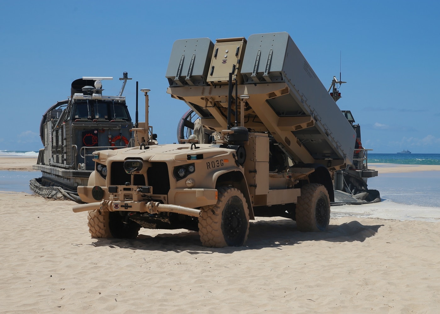 A Navy Marine Expeditionary Ship Interdiction System launcher deploys into position aboard Pacific Missile Range Facility Barking Sands, Hawaii, Aug. 16, 2021. The NMESIS and its Naval Strike Missiles participated in a live-fire exercise, here, part of Large Scale Exercise 2021. During the training, a Marine Corps fires expeditionary advanced base sensed, located, identified and struck a target ship at sea, which required more than 100 nautical miles of missile flight. The fires EAB Marines developed a targeting solution for a joint force of seapower and airpower which struck the ship as the Marines displaced to a new firing position. The Marine Corps EABO concept is a core component of the Force Design 2030 modernization effort. (U.S. Marine Corps photo by Maj. Nick Mannweiler, released)