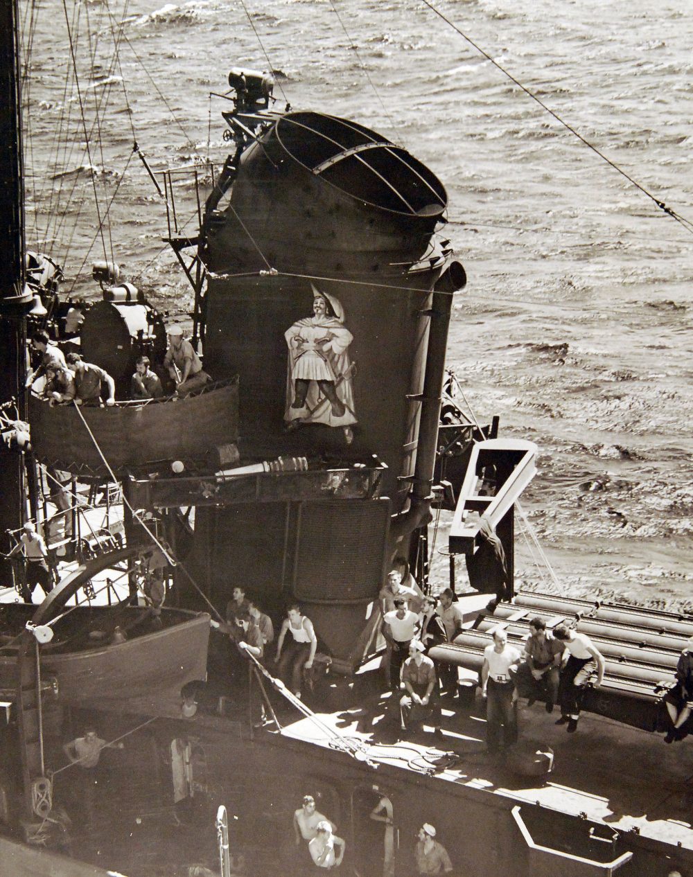 80-G-202517 USS Kidd (DD-661), with an elaborate figure of the famous pirate captain