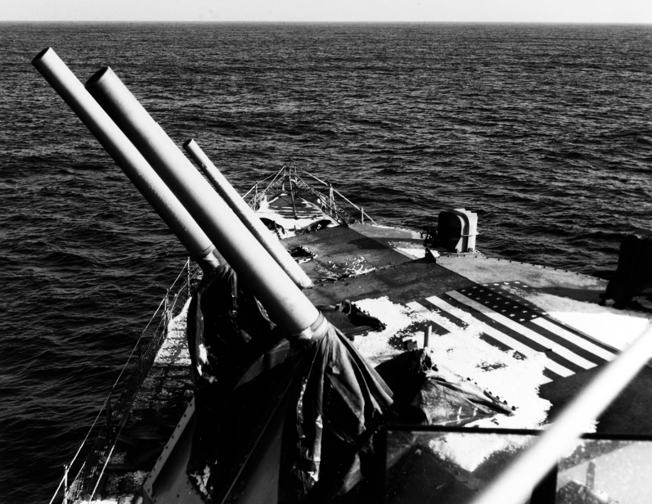 USS Hyman (DD-732) Ship’s forward 5/38 guns aimed at targets on the Korean coast, during bombardment operations in February 1952. Note U.S. flag painted atop mount 52. 80-G-440142