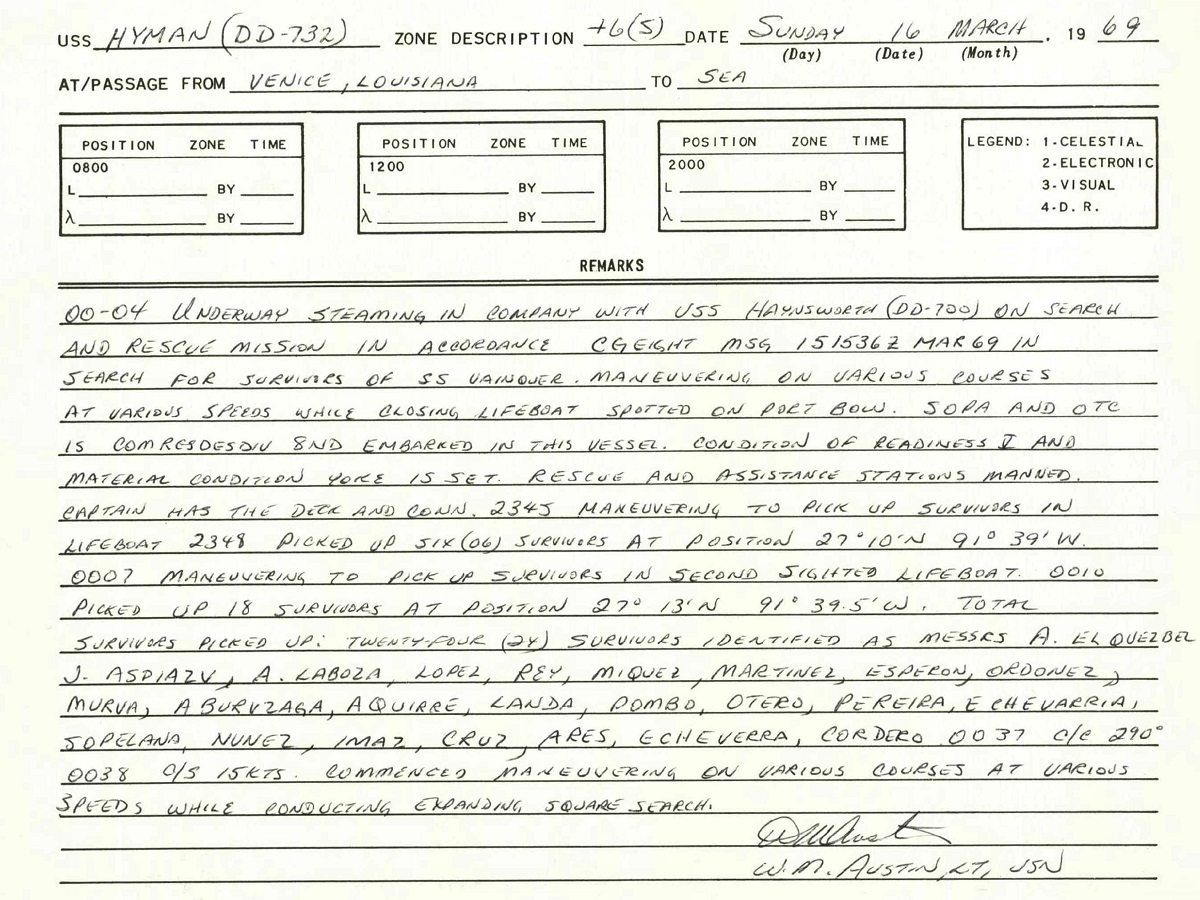 March 16 1969 SS Vainquer Posted on September 14, 2021 by laststandonzombieisland Leave a comment March 16, 1969 Hyman deck log re: SS Vainquer. Via NARA Previous Next Return to Warship Wednesday, Sept. 15, 2021: Hurricane ASW