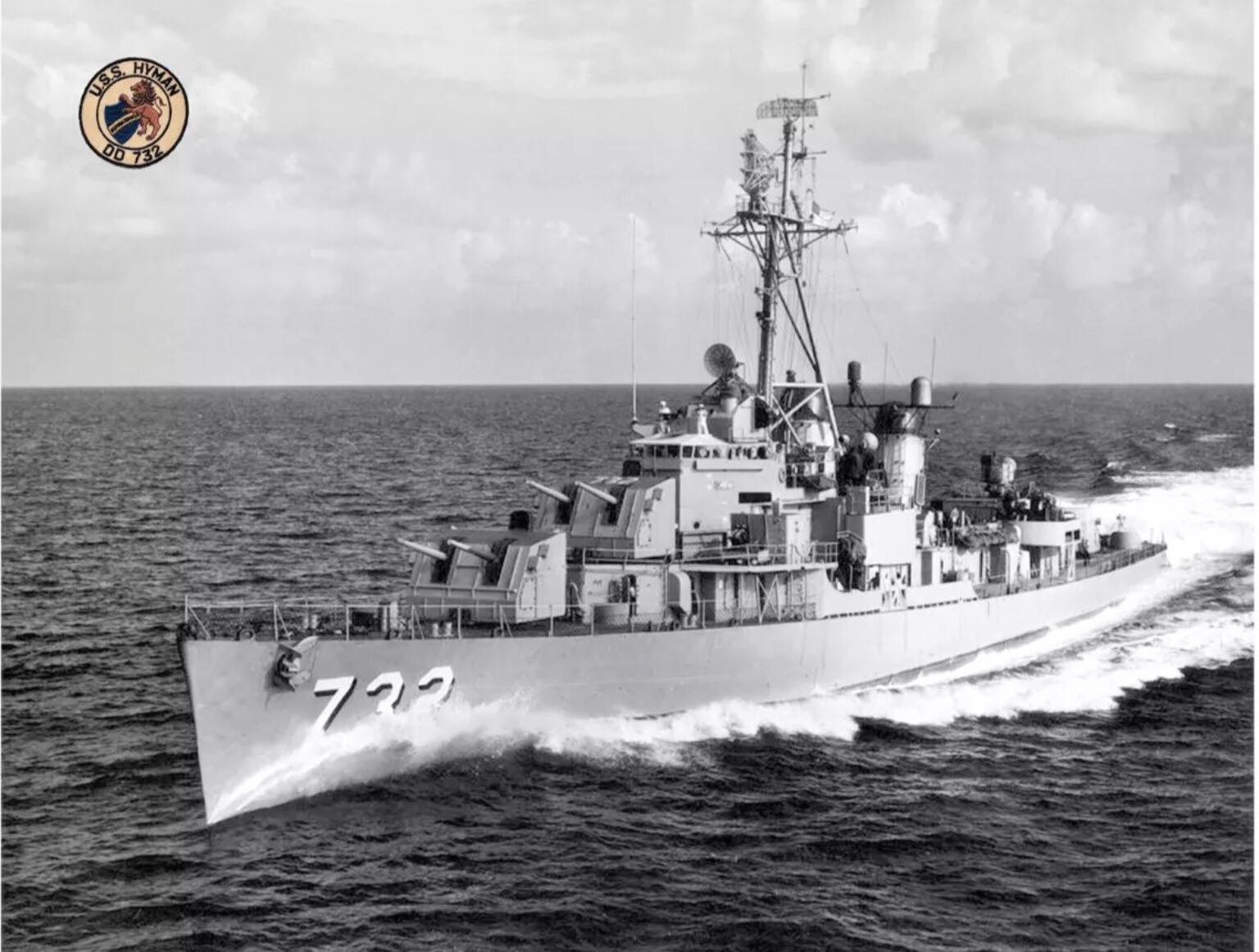 USS Hyman (DD-732) Underway during the early or middle 1950s. This photograph was received by the Naval Photographic Center in December 1959 but was taken several years earlier. Note that the ship still carries 40mm guns (replaced by 3/50s by mid-decade) and 20mm guns but has a tripod foremast and SPS-6 radar (both typically fitted during the early ’50s). She never did receive the FRAM treatment. NH 107139