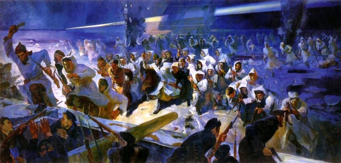 Rudolf Franz’s 1936 painting depicts the storming of Kronstadt by the Red Army to put down the revolt. Over a thousand were killed on both sides and an estimated 2,100 rebellious sailors were executed or disappeared into labor camps.
