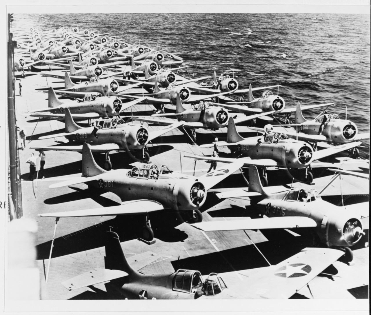 USS SARATOGA (CV-3) flight deck scene, circa fall of 1941. Grumman F4F-3 “Wildcats” of VF-3 “Felix the Cat” are in the foreground (one wearing the two toned gray scheme approved in October 1941); Douglas SBD-3 “Dauntless” and Douglas TBD-1 “Devastator” aircraft are parked beyond.