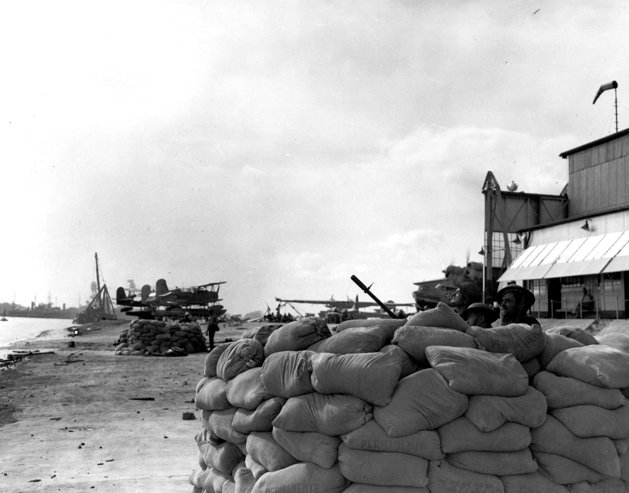 “Sandbagged .30 caliber machine gun emplacement with gun crew on alert, at the seaplane base near Ford Island’s southern tip, soon after the Japanese attack.” The gun is a superfast-firing ANM2, pulled from an aircraft. Note the beached battleship, USS Nevada, in the distance. Official U.S. Navy Photograph, now in the collections of the National Archives. #: 80-G-32492