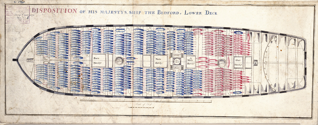 The disposition of the crew’s sleeping spaces aboard HMS Bedford, a 74 gun ship of the line, in 1775. Sailors’ hammocks are in blue, the Marines are in red. Via the Royal Museums Greenwich.