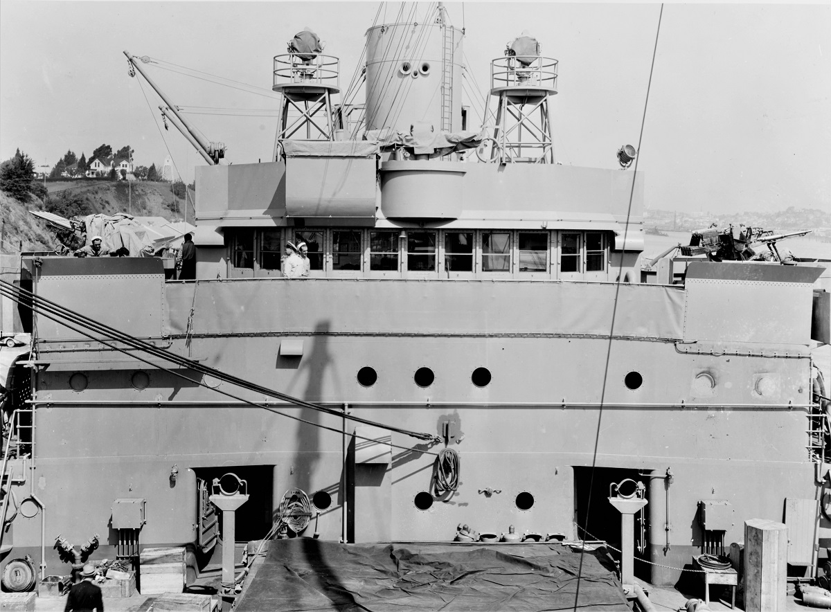 The Lassen-class ammunition ship USS Rainer (AE-5), view of the ship’s bridge, taken at the Mare Island Navy Yard, 15 April 1942. Note 1.1″ anti-aircraft guns on each bridge wing. 19-N-29183.