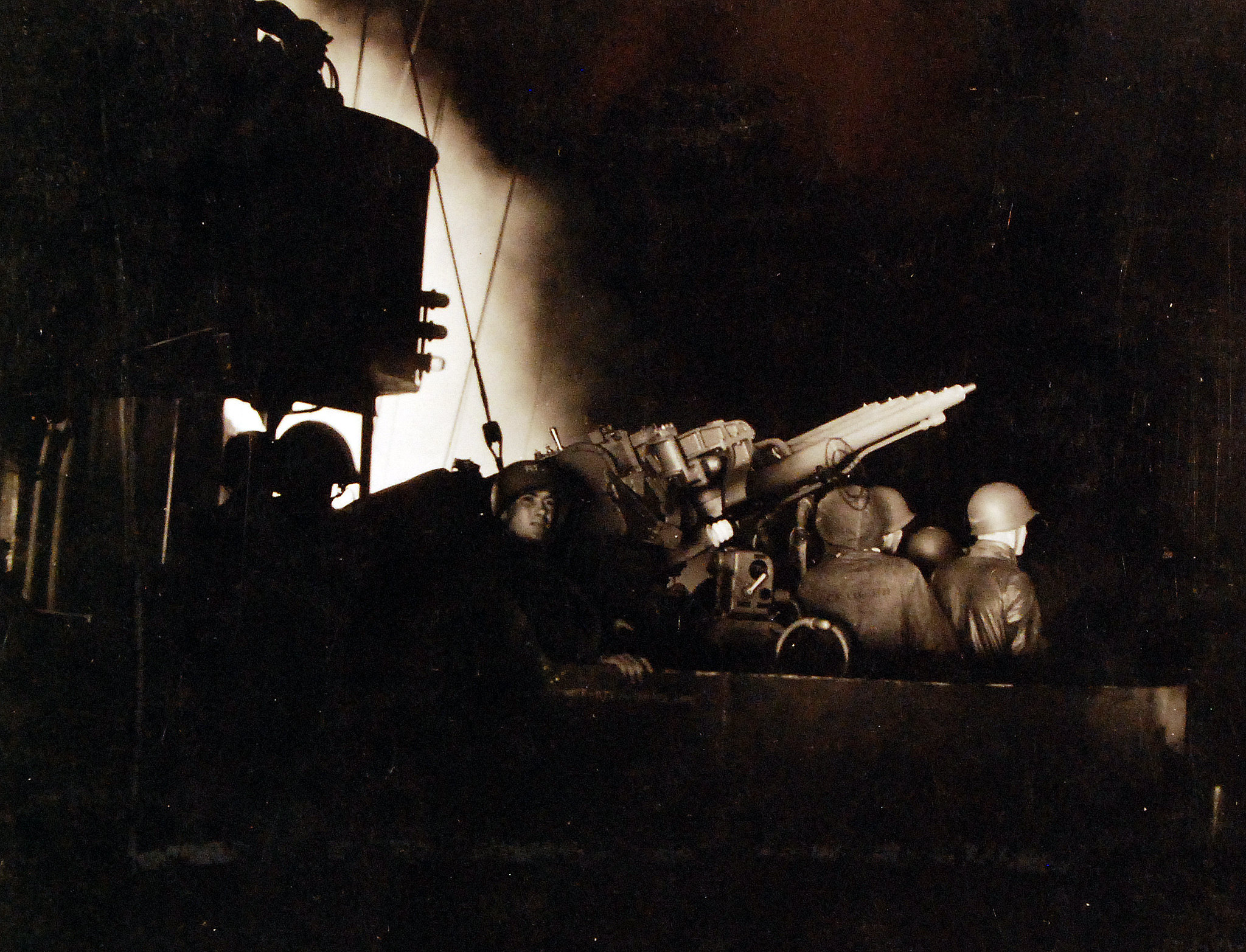 80-G-54554: Battle of the Kula Gulf, July 5-6, 1943. Aboard USS Honolulu (CL 48). Shown is the night gunnery by the 1.1 gun crew on superstructure lit by gunfire.
