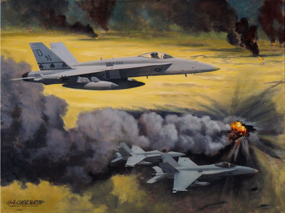Over the Oil Fields, by Col H. Avery Chenoweth, USMCR. “Towards the war’s end, the Bahrain-based Shamrocks of VMFA-333 were able to survey damage caused by their bombing runs. Previously, the ground fire had caused the F/A-18’s to pull out rapidly from their dive-bombing runs, no chance for visual confirmation.” Photo via the National Museum of The Marine Corps.