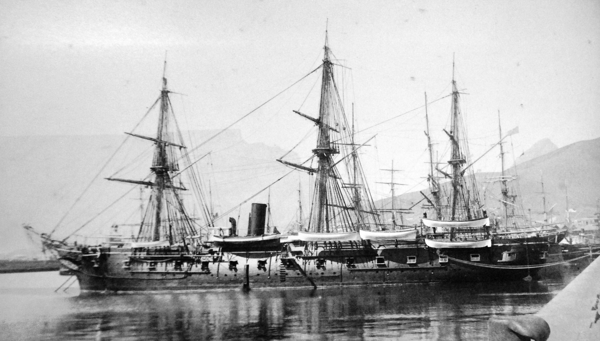 U.S. Navy Expedition to observe the 1889 solar eclipse from Africa. USS Pensacola, screw steamer, at Cape Town Docks, South Africa. Table Mountain is in the background. Photographed by Herman S. Davis, who was the assistant astronomer of the expedition. LOC Lot 7360-2