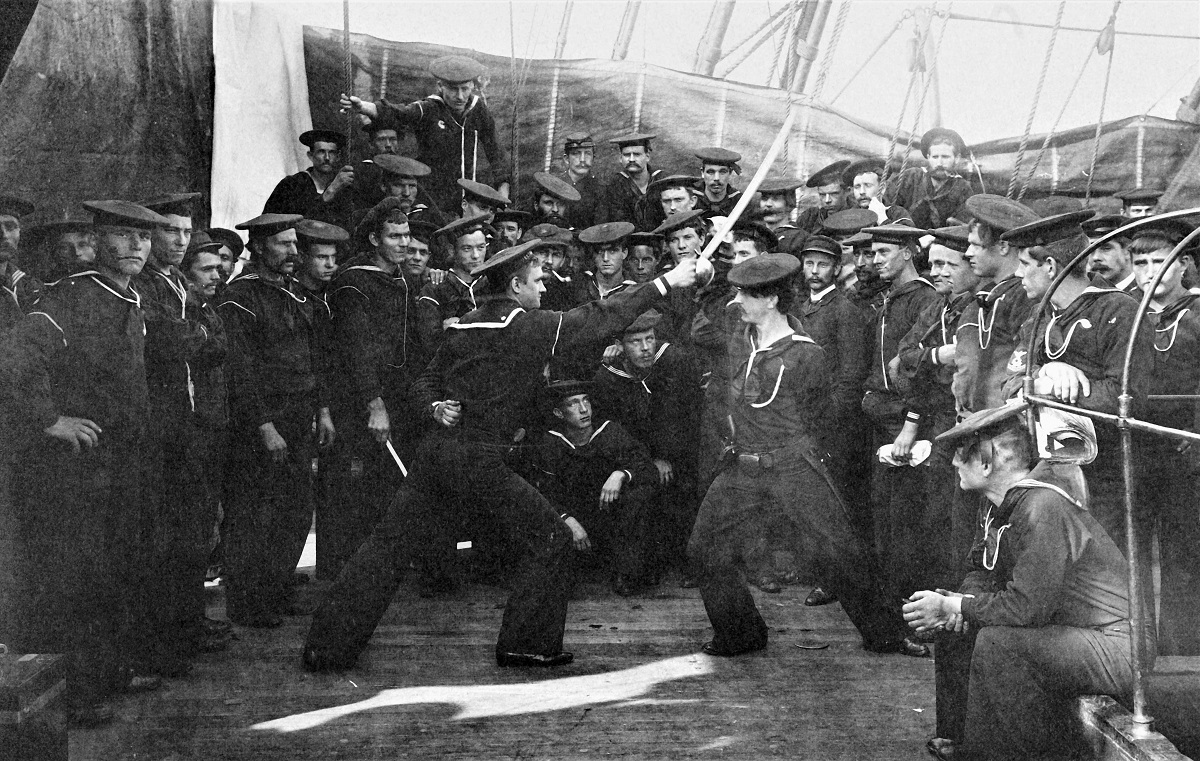 NH 42894 Posted on April 6, 2022 by laststandonzombieisland Leave a comment Two crewmen fencing with cutlasses, as others watch, probably upon her return to the U.S. in February 1888. Note revolver worn by one of the combatants. NH 42894 Previous Next Return to Warship Wednesday, April 6, 2022: The Forlorn Hope