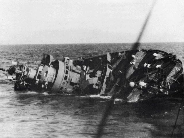 Italian destroyer Libeccio slips beneath the waves after being torpedoed by HMS Upholder, Ionian Sea, November 1941.