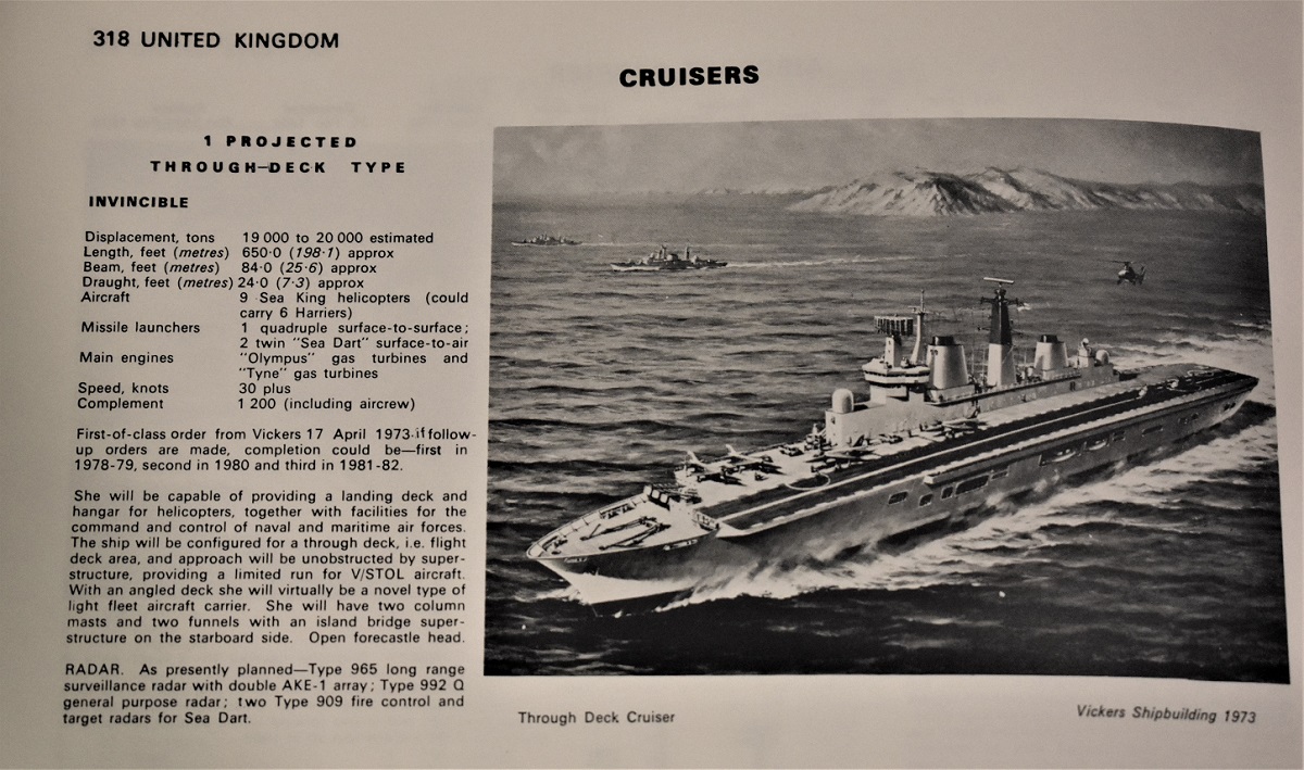 Invincible through deck cruiser Janes 1973 Posted on May 3, 2021 by laststandonzombieisland Leave a comment 1973 Jane’s. Note her intended air wing would be only 15 helicopters and Harriers. Next Return to 45 Years Ago Today: Harrier Carrier (Cruiser?), Ahoy!