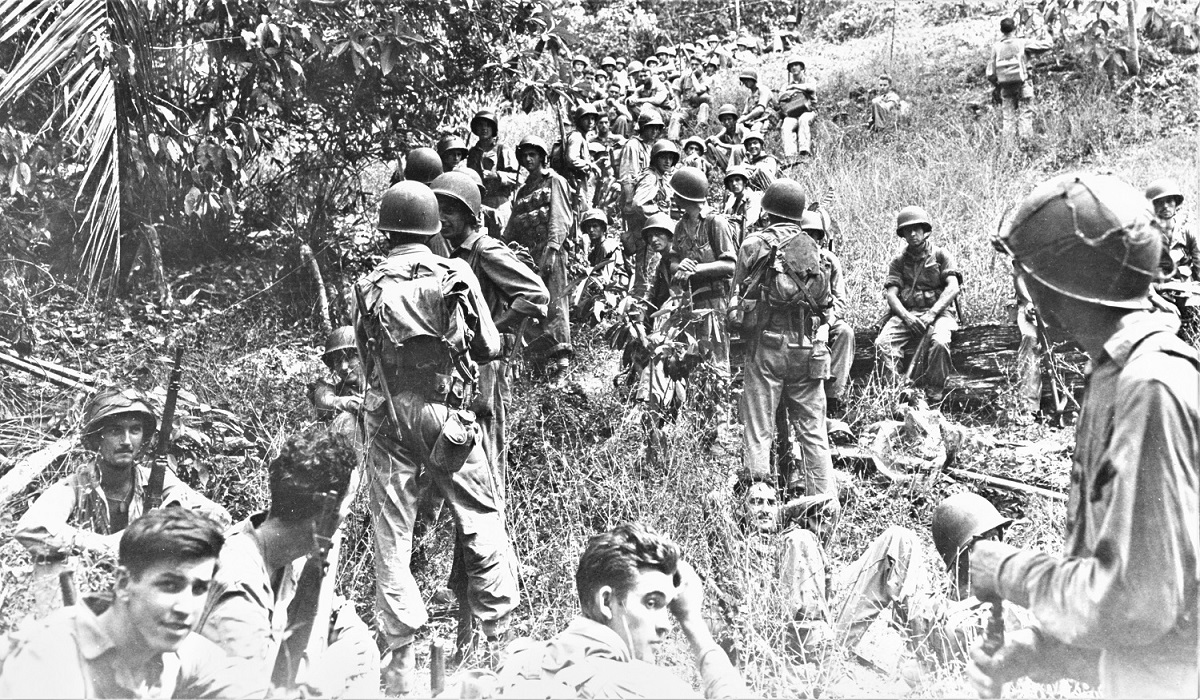 Guadalcanal Campaign U.S. Marines rest in the field on Guadalcanal, circa August-December 1942. Most are armed with M1903 bolt-action rifles and carry M1905 bayonets along with USMC 1941 pattern packs. Two men high on the hill at right have vests to carry patrol mortar shells and one in center has a World War I style hand grenade vest. The Marine seated at far right has an M1918 Browning Automatic Rifle. (Photo: U.S. Navy Photograph, now in the collections of the National Archives.)