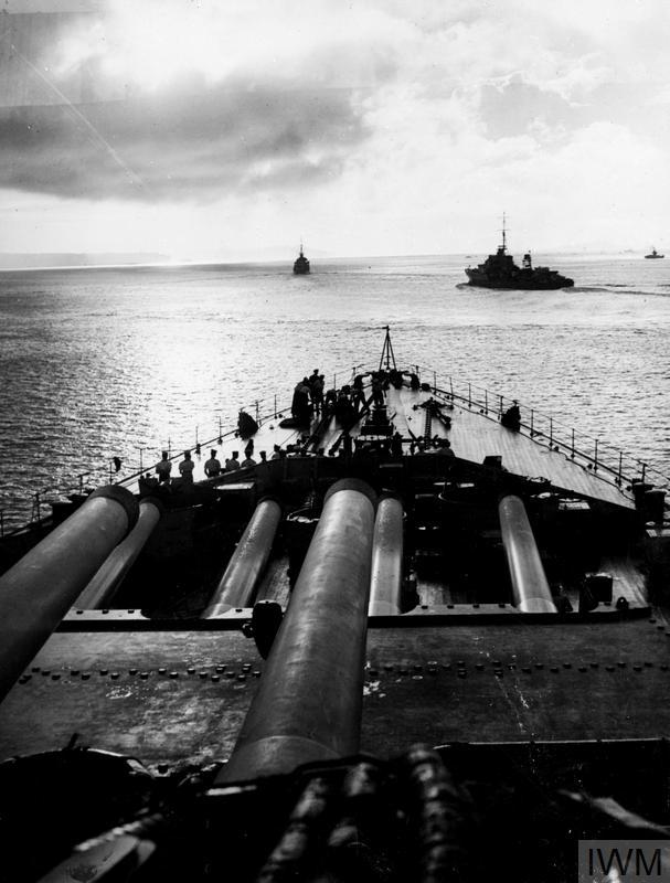 THE BATTLESHIP HMS HOWE IN NEW ZEALAND WATERS. JANUARY 1945, ON BOARD HMS HOWE, FLAGSHIP OF ADMIRAL BRUCE FRASER, C IN C BRITISH PACIFIC FLEET, WHEN SHE WAS IN NEW ZEALAND WATERS AND DURING HER VISIT TO AUCKLAND. (A 28861) Destroyer escort seen from the bridge of the HOWE. Copyright: © IWM. Original Source: http://www.iwm.org.uk/collections/item/object/205160182