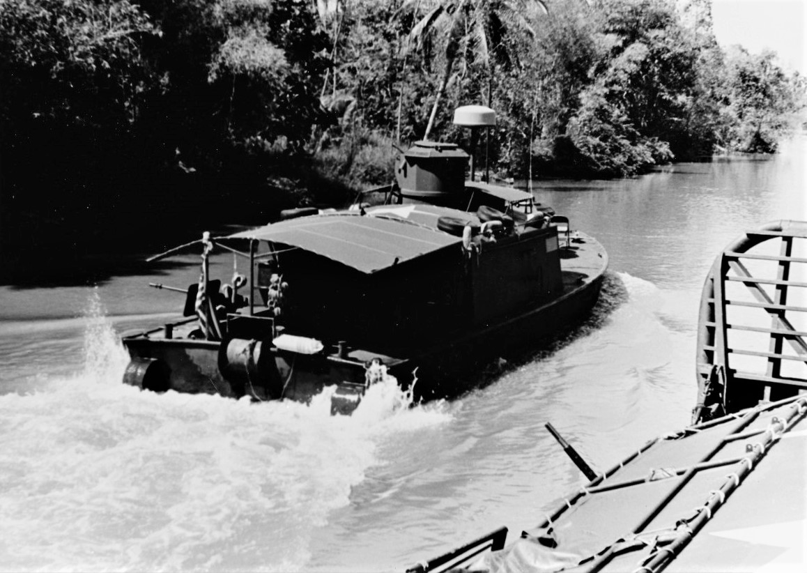 An Assault Support Patrol Boat (ASPB) of Task Force 117 moves slowly up the outboard side of an Armored Troop Carrier (ATC). The ATC is sweeping for Vietcong command detonated mines during a Mobile Riverine Force search and destroy mission. The boats are assigned to River Assault Flotilla One, 16 December 1967. USN 1132289