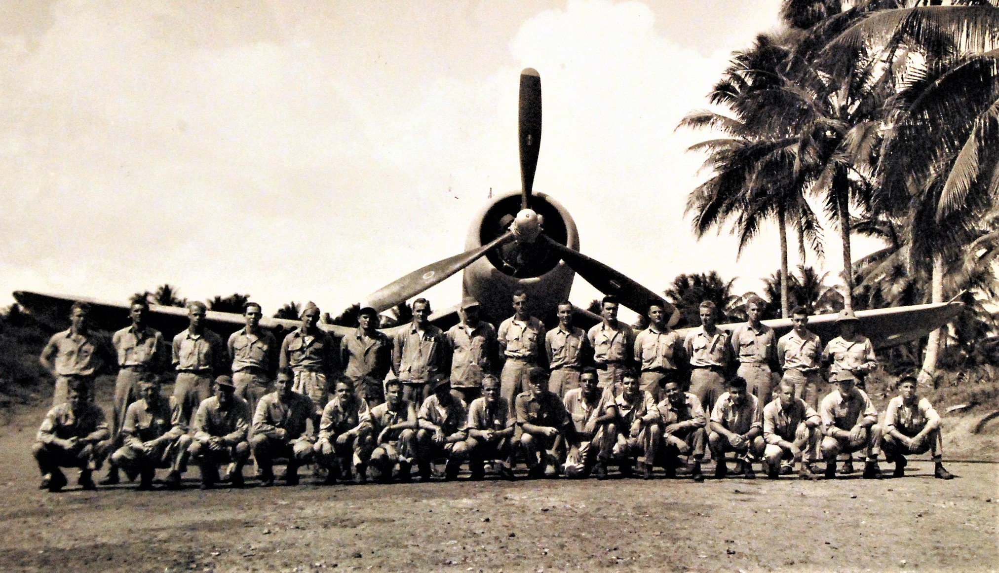 Marine Attack Squadron Two Hundred and Fourteen – VMF 214 (Black Sheep Squadron) on Turtle Bay Fighter Strip, Espiritu Santo, New Hebrides. They are shown before leaving for Munda, with an F4U in the background, 11 September 1943. Note, Major Gregory “Pappy” Boyington, 8th from left, front row. U.S. Navy photograph, now in the collections of the National Archives. 80-G-54288.