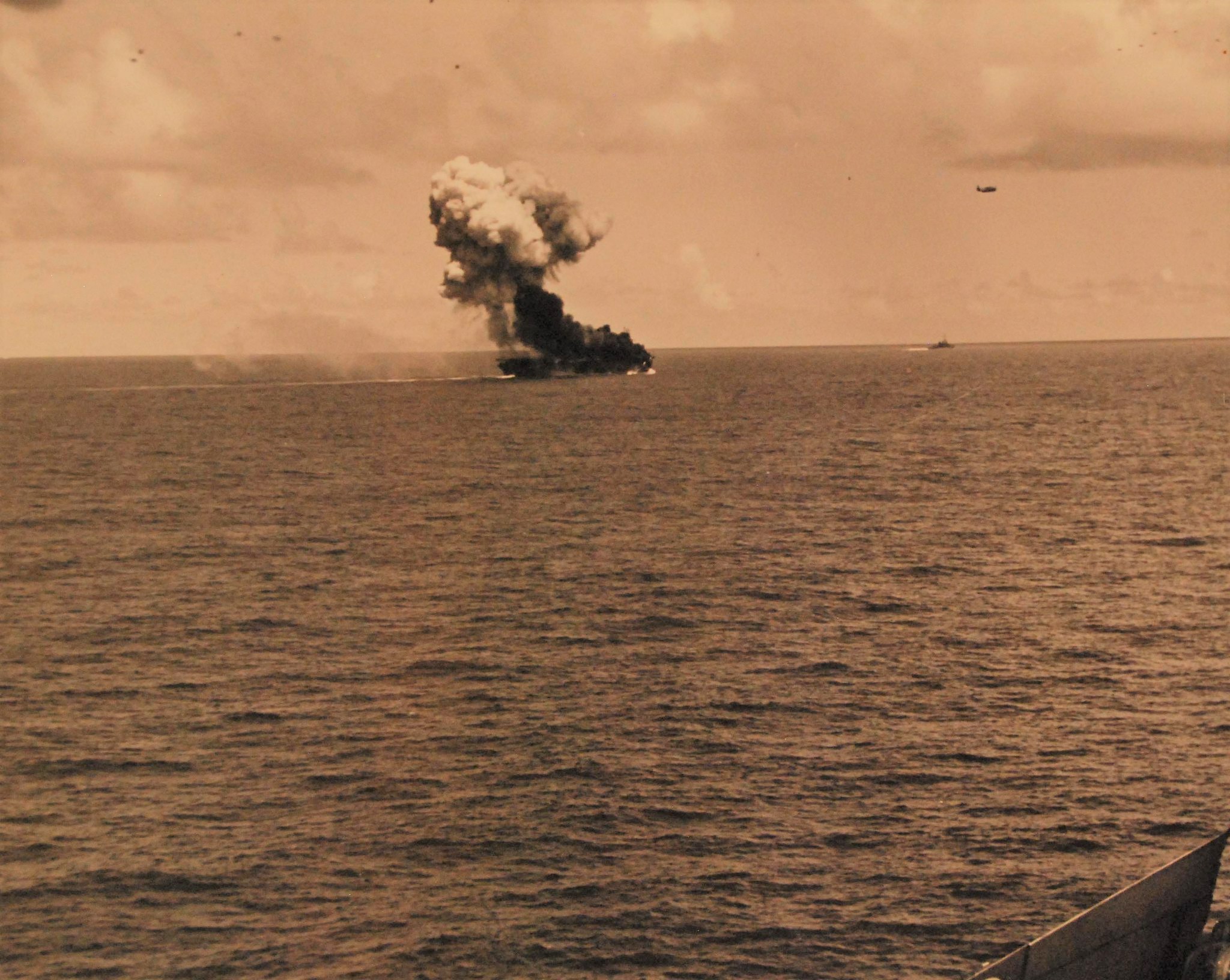 Fires and explosion on the flight deck of USS Suwannee (CVE 27), resulting from a suicide hit of a Japanese “Zero” near Leyte, Philippines. The airborne plane is friendly. Taken from USS Sangamon (CVE 26) at Leyte, Philippines, 26 October 1944. 80-G-270619