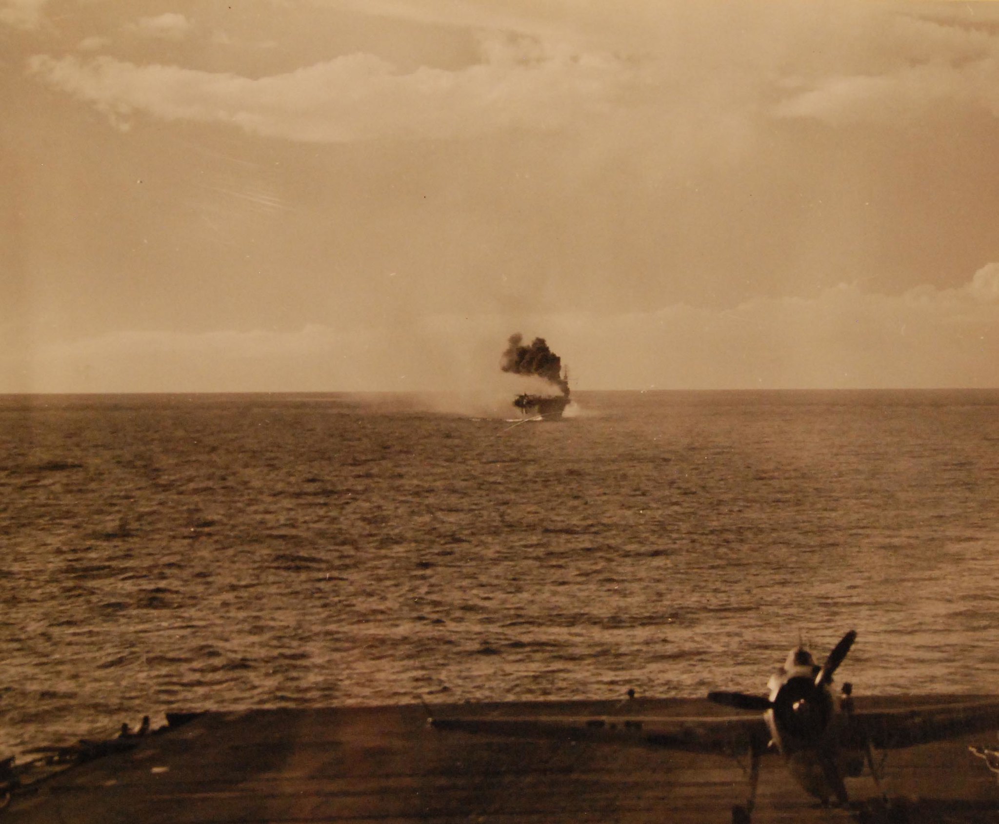 Fires and explosion on USS Suwannee (CVE 27) resulting from a suicide hit of a Japanese “Zero” near Leyte Gulf, Philippines, taken from USS Sangamon (CVE 25), 25 October 1944. 80-G-270626