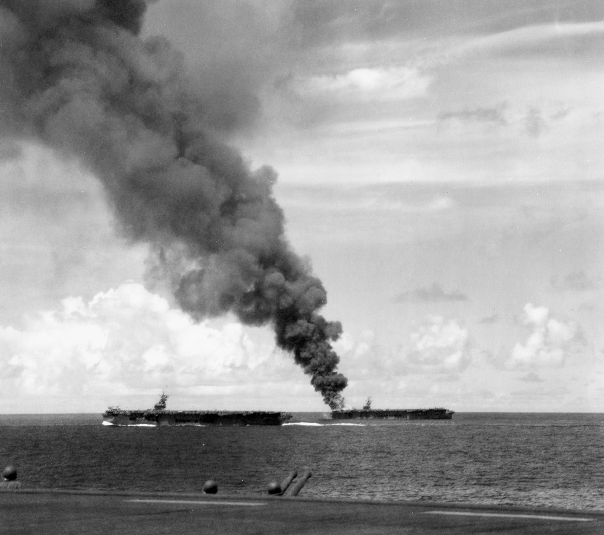 U.S. Navy escort carriers pictured at sea during the Battle of Leyte Gulf. The photograph was probably taken from USS Petroff Bay (CVE-80), which was part of Task Unit 77.4.1 (Taffy I), together with the USS Sangamon (CVE-26), USS Suwannee (CVE-27), and USS Santee (CVE-29). The carrier burning in the background is most probably Suwannee, which was hit by two kamikazes, Santee by one amidships. U.S. Navy National Museum of Naval Aviation photo No. 2000.236.023