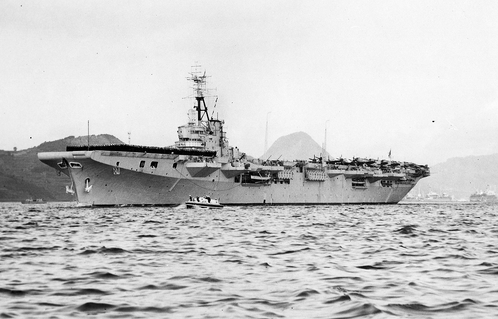HMS Ocean with her paying off pennant streaming from her mast sailing from Sasebo October 31st, 1953, for the voyage home to the UK, via The Royal Navy Research Archive.