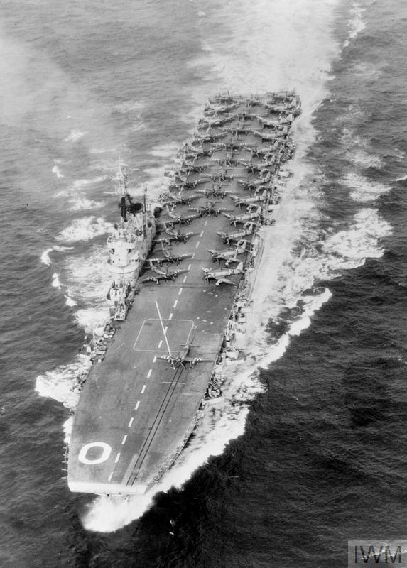 HMS OCEAN TAKES PART IN LARGE RAID ON PYONGYANG. 11 JULY 1952, AERIAL PHOTOGRAPHS OF, AND ON BOARD THE LIGHT FLEET CARRIER HMS OCEAN, AS SHE TOOK PART IN OPERATION PRESSURE PUMP, TARGETING THE NORTH KOREAN CAPITAL OF PYONGYANG. REAR ADMIRAL SCOTT-MONCRIEFF, FLAG OFFICER 2ND IN COMMAND FAR EAST STATION, AND TWO AMERICAN FLAG OFFICERS, ADMIRAL J J CLARKE, COMMANDER US 7TH FLEET, AND REAR ADMIRAL GINGRICH, WATCHED THE RETURN OF THE SECOND STRIKE AIRCRAFT TO HMS OCEAN FROM THE BRIDGE. (A 32259) HMS OCEAN at speed about to catapult her aircraft. Copyright: © IWM. Original Source: http://www.iwm.org.uk/collections/item/object/205016296