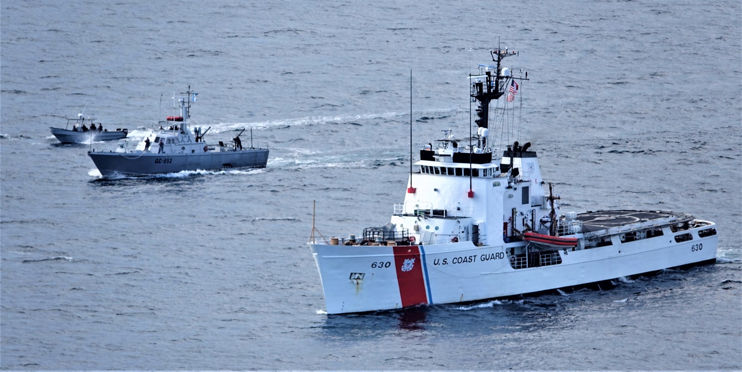 The Coast Guard Cutter Alert (WMEC 630) conducts an engagement coincidental to operations with members of the Guatemalan Navy August 23, 2022, five miles south of Puerto Quetzal, Guatemala. The engagement to strengthen law enforcement and search and rescue capabilities with our partners in Guatemala included joint pursuit training with two Guatemalan small boats, and a search-and-rescue exercise with the Guatemalan vessels Kukulkan and the Kaibil Balam. U.S. Coast Guard courtesy photo.