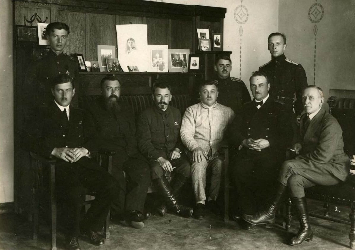 Members of the Provisional Amur Government in Vladivostok, 1922. In the center are the brothers Spiridon (Chairman of the Government) and Nikolai Merkulov (Minister of Foreign Affairs), to the right is Admiral Georgy Stark (commander of the Siberian Flotilla).