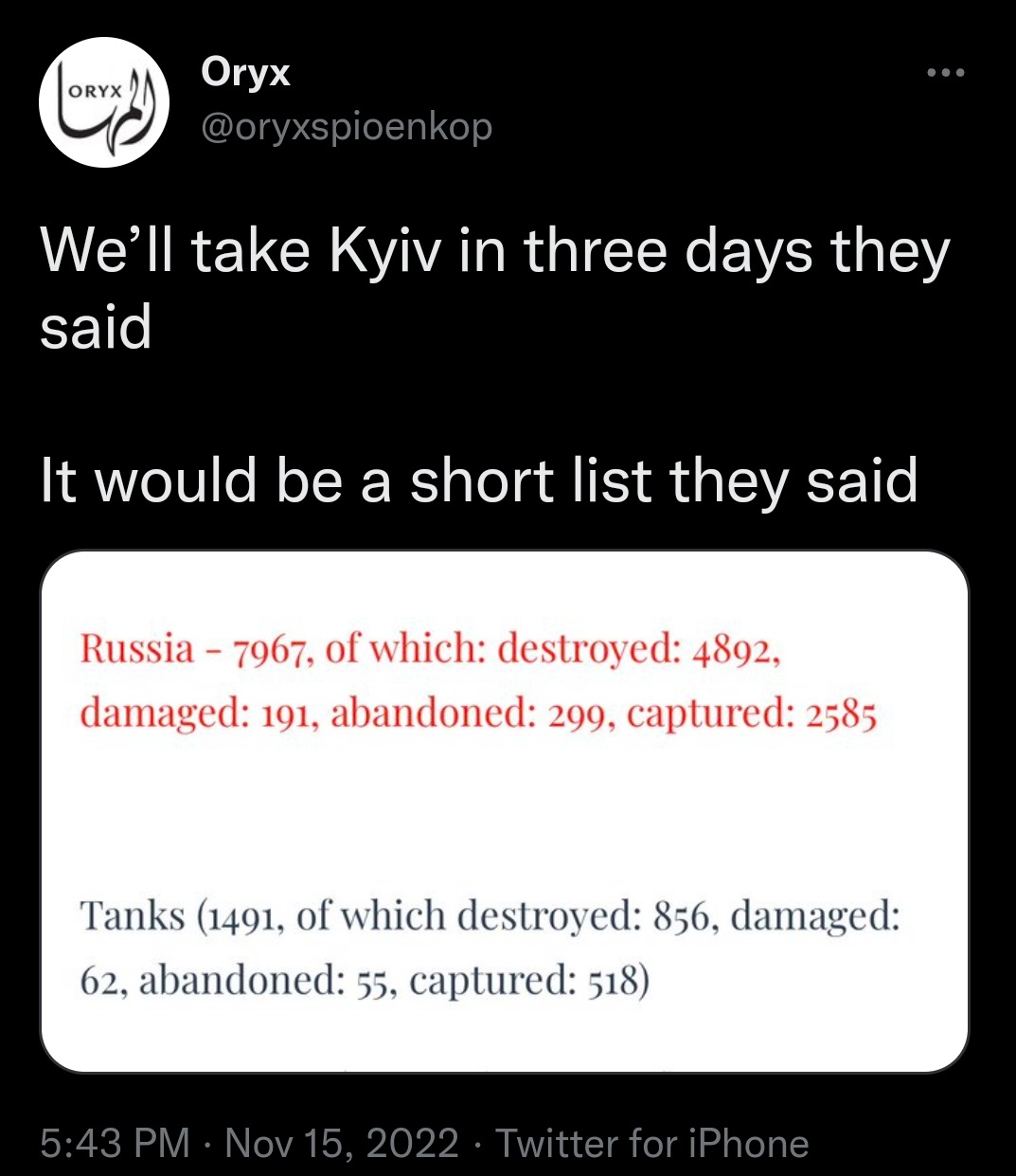 Oryx Ukraine Russia Posted on November 20, 2022 by laststandonzombieisland Leave a comment Return to Another Milestone from Ukraine
