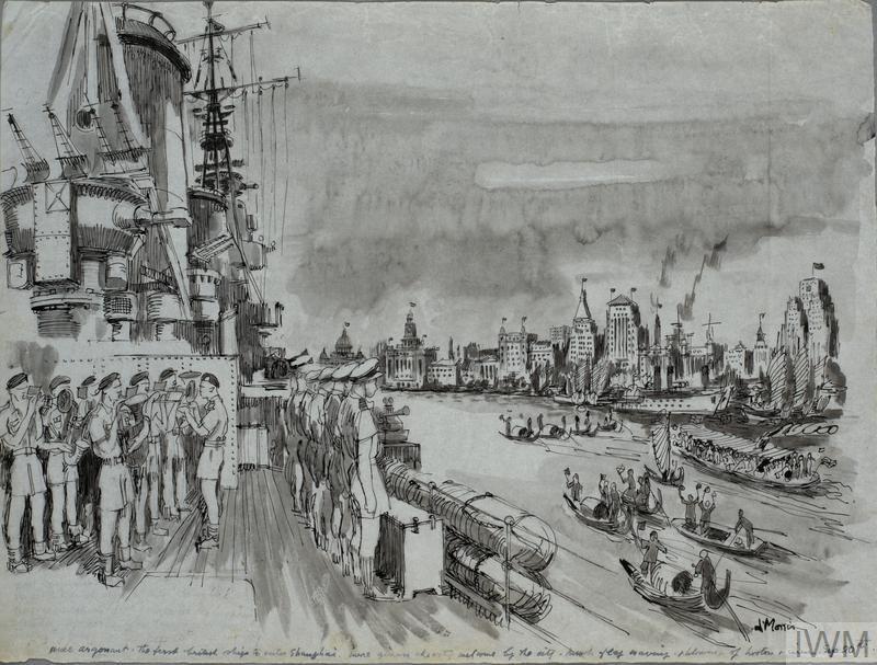 “HMS Argonaut, the first British ship to enter Shanghai after the Japanese surrender, September 1945.” A scene from the deck of HMS Argonaut as she sails into Shanghai harbor. A ship’s company stands to attention along the rail and behind them, the ship’s band plays. The towering buildings along the dockside of Shanghai stand to the right of the composition. Below the ship, Chinese civilians wave flags from a convoy of sampans. Ink and paper drawing by James Morris. IWM Art collection LD 5531 http://www.iwm.org.uk/collections/item/object/19676