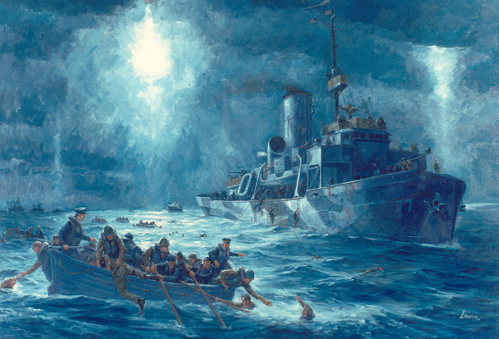 Painting of the crew from Coast Guard Cutter Escanaba rescuing survivors from the torpedoed USAT Dorchester. U.S. Coast Guard image
