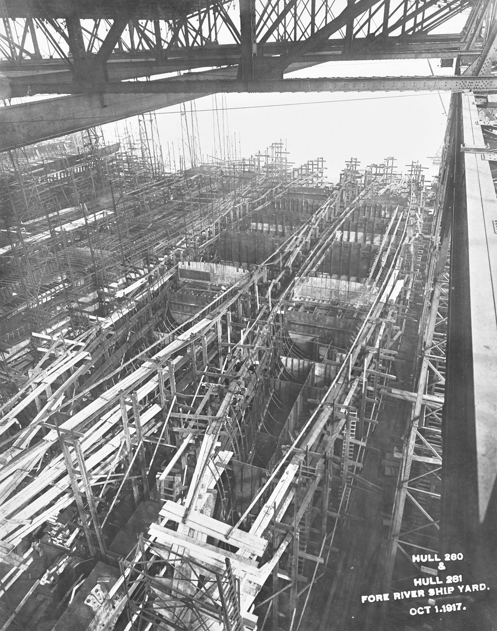 Destroyer hulls on the building ways at Fore River, 1 October 1917. Those closest to the camera are the future USS Colhoun (DD-85) and Stevens (DD-86), which had builder’s numbers 280 and 281. The ships on the left are probably the future USS Sigourney (DD-81) and Gregory (DD-82). NH 43019