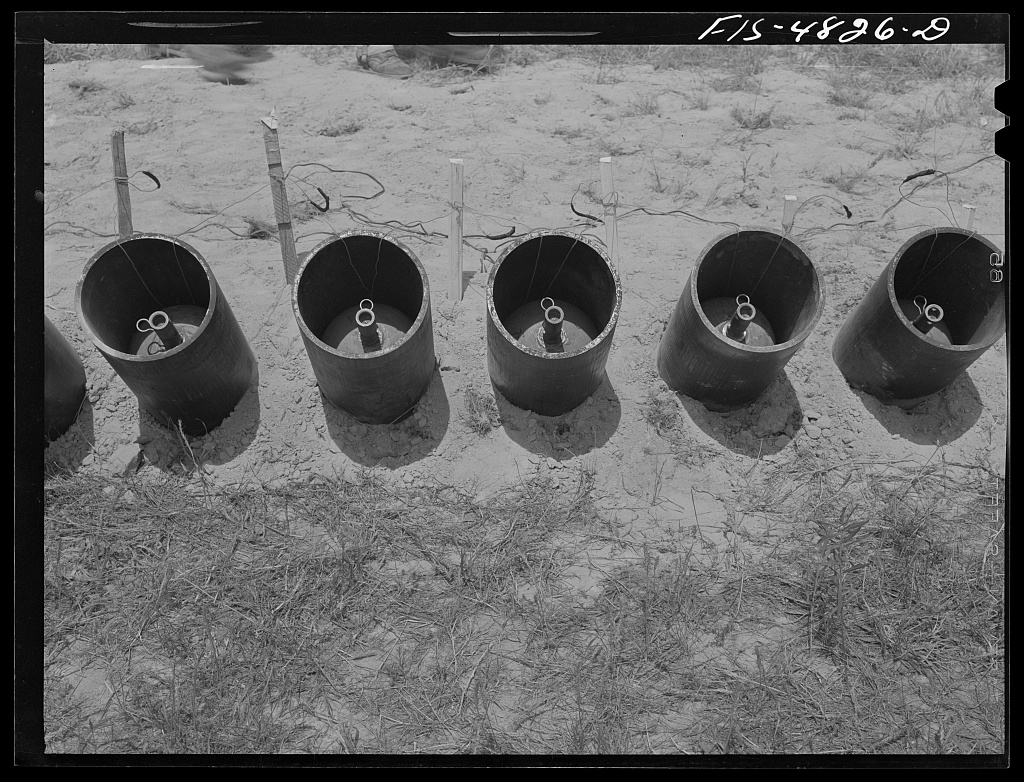 Livens projectors: simple 8-inch steel tubes fitted with a 28-pound baseplate and single 65-pound projectile (filled with 30 pounds of agent) and electrically fired. The 30th Engineers would use as many as 900 of these at a time, typically in 20-tube batteries set well back behind the lines to prevent enemy observation. Once fired, they had to be dug up and reset before firing again as their azimuth would be screwed. The range was out to 1850 yards, depending on the angle. The Army kept these around well into WWII.