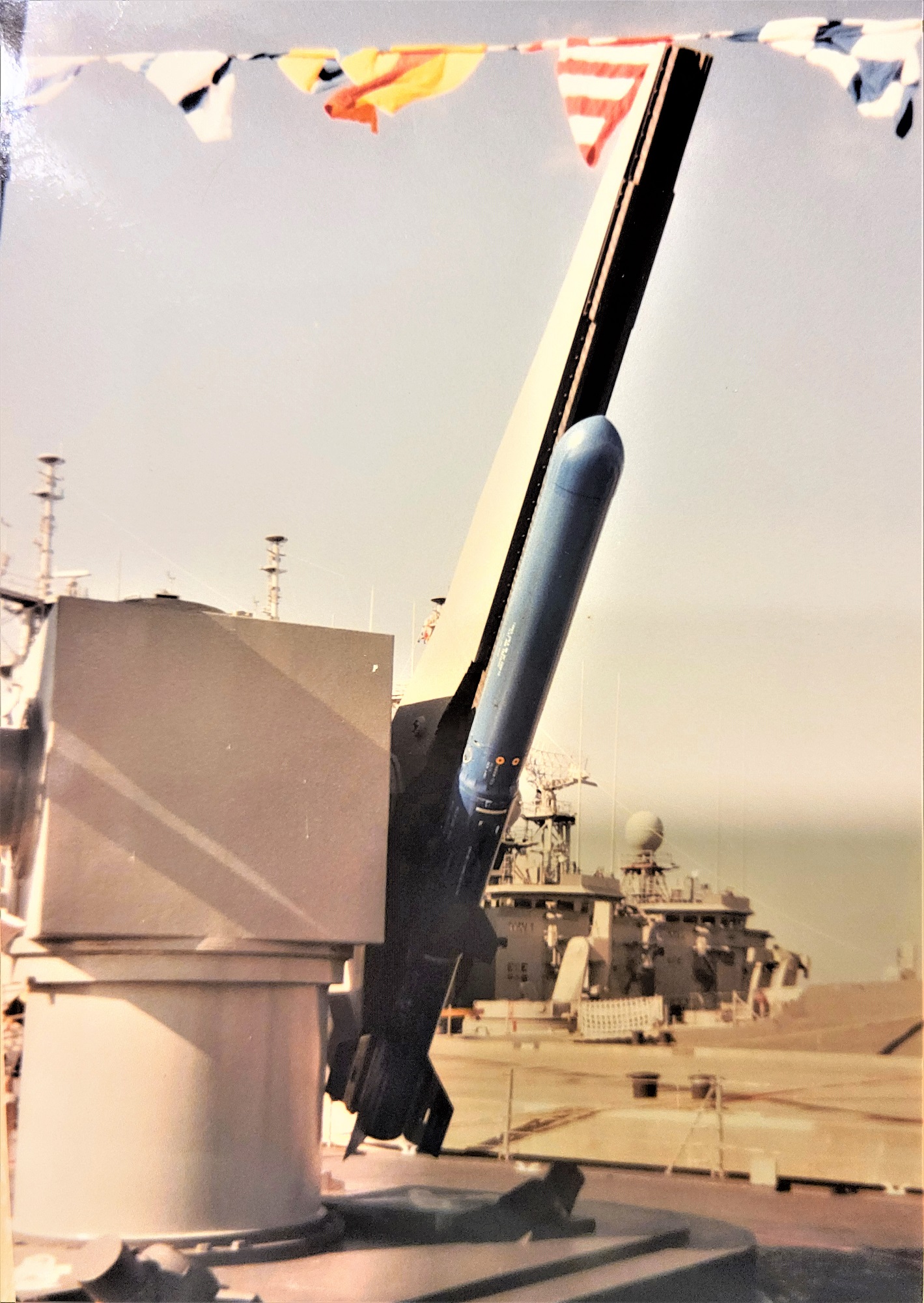 USS Mississippi (CGN-40) at Naval Station Pascagoula, Feb 1996. Note the big blue ASROC drill missile and three more Perry class NRF frigates (FFG-20, FFG-24, FFG-32). With the Mark 26, two missiles could be on the rails and it could sustain a 9-second firing rate with a one-second salvo delay. Photo by Chris Eger