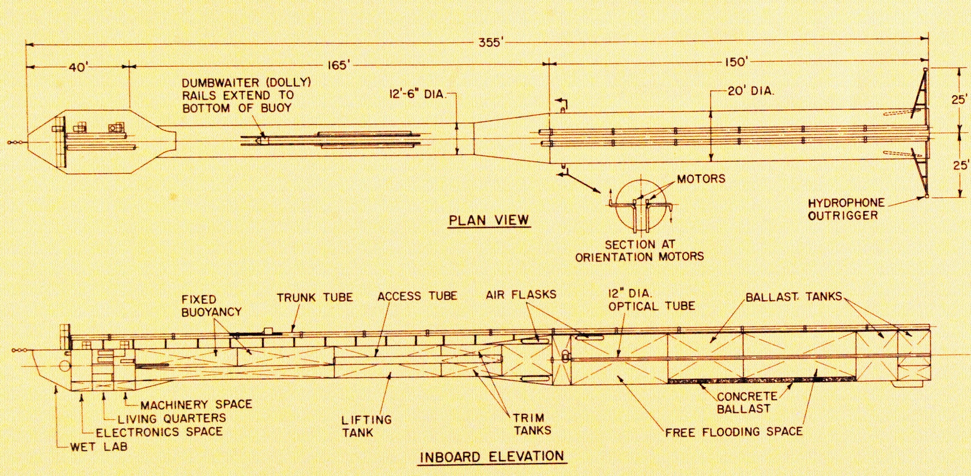 330-PSA-149-62 (USN 1060451): A new oceanographic research vessel – Floating Instrument Platform (FLIP), has been constructed for the Marine Physical Laboratory of Scripps Institution of Oceanography under contract to the Office of Naval Research. When the craft is flipped to a vertical position, the bow section remains above, water, shown here are the plan view and inboard elevation of the research craft. Photograph released May 25, 1962