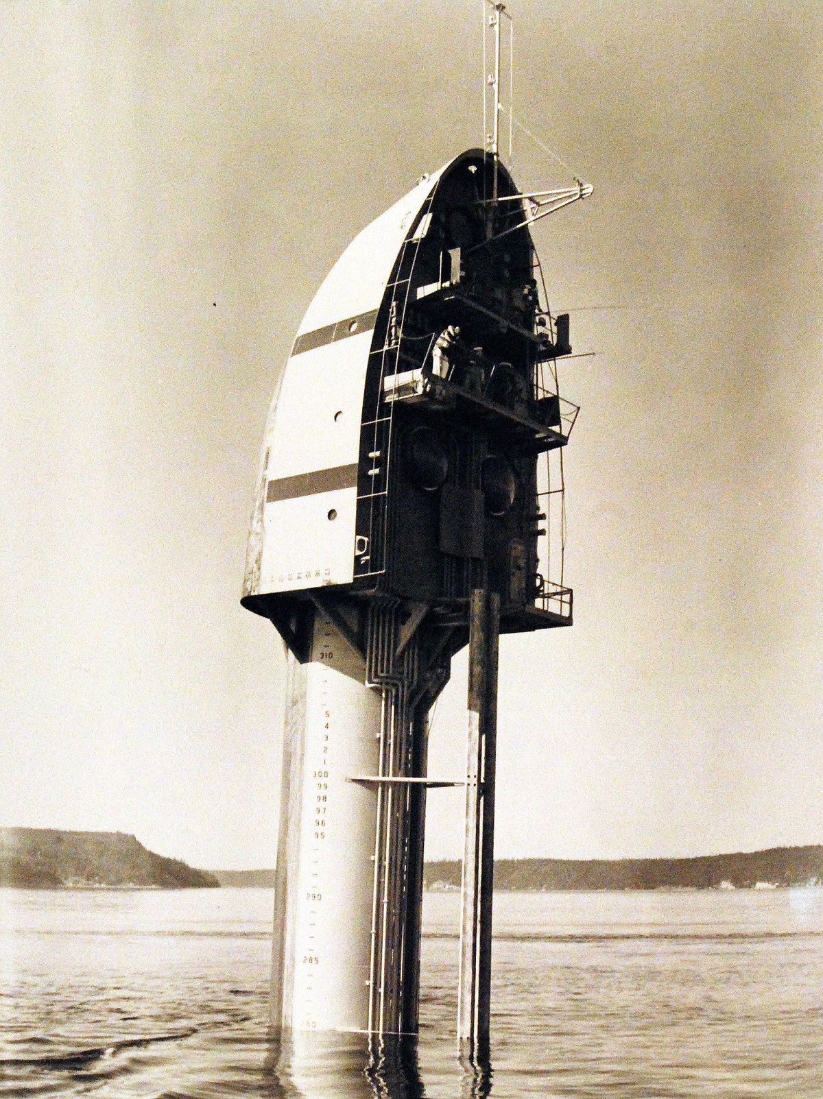 Offical caption: Floating Instrument Platform (FLIP). FLIP is in the vertical position. Photograph released August 7, 1962. Master caption: A new type of oceanographic research vessel – Floating Instrument Platform (FLIP) – is undergoing operational tests by the U.S. Navy in Dabob Bay, near Seattle, Washington. FLIP has been constructed for the Marine Physical Laboratory of Scrupps Institution of Oceanography under contract to the Office of Naval Research. The craft can literally flip from a horizontal to a vertical position while at sea. FLIP is flipped into the vertical position by flooding its long aft section with sea water. Only its “four story” bow section remains above the water. To return the vessel to a horizontal position, high pressure air blows the water out of the submerged section. FLIP will be used for studies of wave motion, marine biology, internal waves, sound waves, and other phenomena. The vessel has accommodation for four people and can carry enough supplies to last for about two weeks. In the vertical position, the research laboratories, living quarters, and engine room are above the water. Two diesel engines supply electrical power for air conditioning and other miscellaneous electrical equipment. Two waterfront tubes permit the crew to descent to 150 feet below the water. Upon completion of the tests in Dabob Bay, FLIP will be towed to San Diego, California, to begin its sea voyages. 330-PSA-207-62 (USN 1061426)