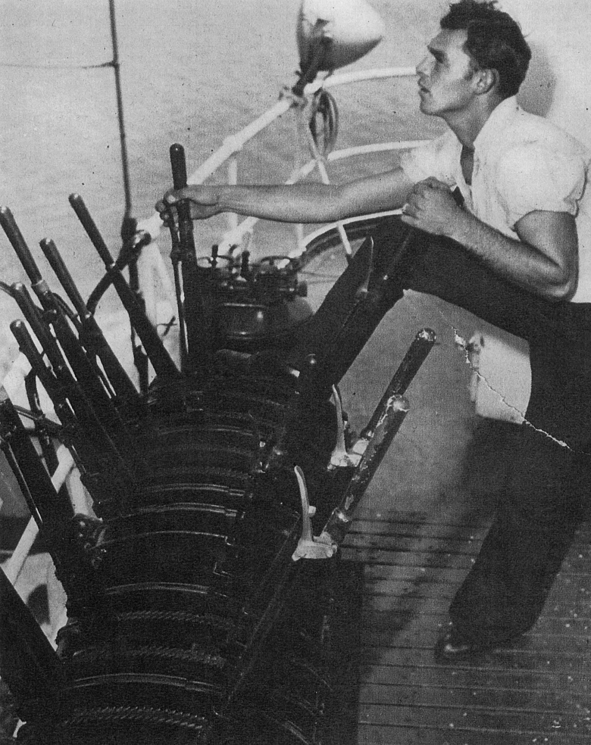 The deck gear included a 20-ton capacity boom with a steam-powered hoist, here seen in action aboard Lilac in 1948. (Philadelphia Inquirer archives)