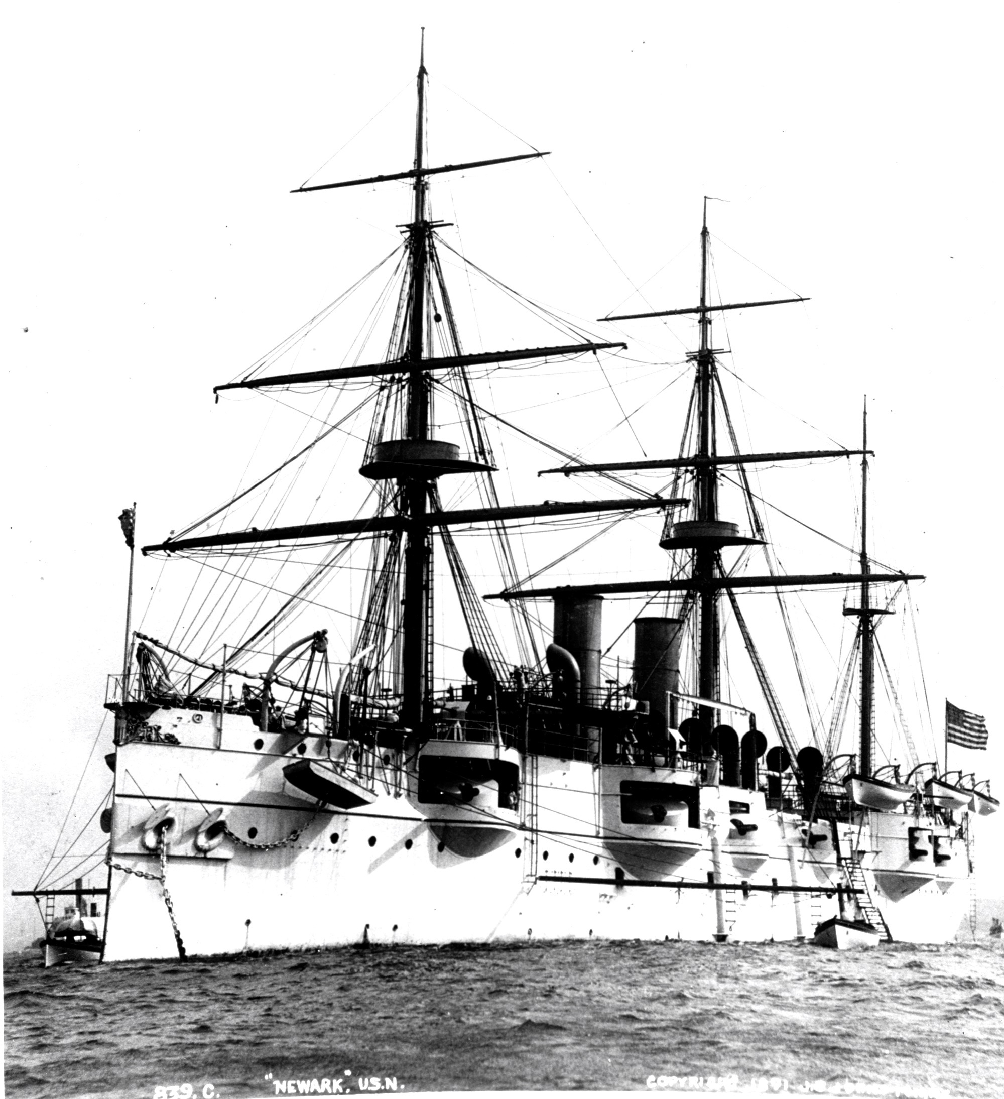 NH 69195 Posted on September 6, 2023 by laststandonzombieisland Leave a comment Another J.S. Johnston, New York image from 1891 of Newark, this time from the stern, showing her with boats alongside. NH 69195 Previous Next Return to Warship Wednesday, Sept. 6, 2023: Of Mustaches, Stars, and Condemned Cannons
