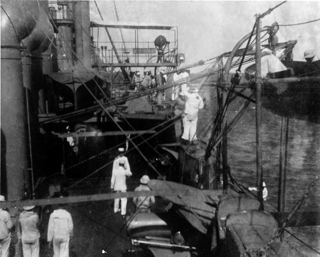 NH 80793 Posted on September 6, 2023 by laststandonzombieisland Leave a comment USS Newark (C-1) hoisting in the steam launch, preparatory to going to sea, 9 August 1898. Note her dark wartime topside scheme. NH 80793 Previous Next Return to Warship Wednesday, Sept. 6, 2023: Of Mustaches, Stars, and Condemned Cannons