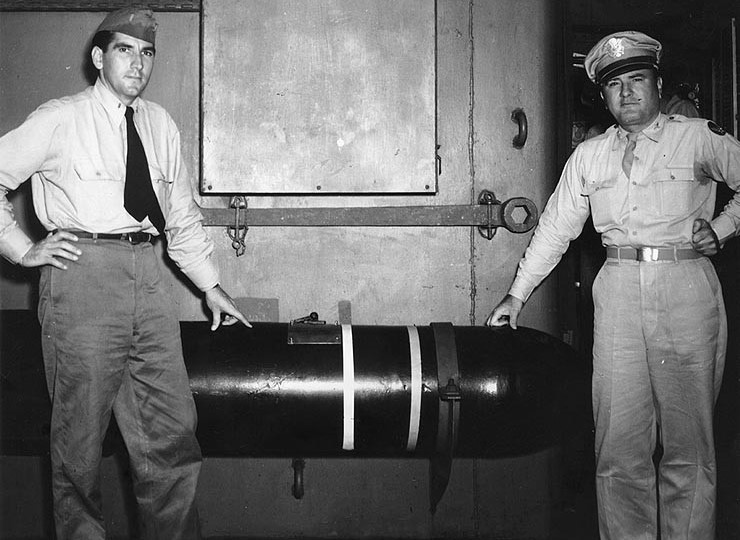 Official caption: On the morning of March 27, 1945, during Okinawa preparations four suicide planes attacked the light cruiser, USS Biloxi. Three were shot down in flames but the fourth broke through the umbrella of ack-ack to smash itself against the cruiser’s side. Later investigation revealed a 1,100 bomb that failed to explode. Rendered harmless, the bomb became the prized possession of the quarterdeck where it is shown being examined by Major Anthony V. Ragusin (right) of Biloxi, Miss., and Ensign Jack Fisher, USNR, of Natchitoches, La., both of whom are attached to the staff of the Commander in Chief Pacific Ocean Areas.