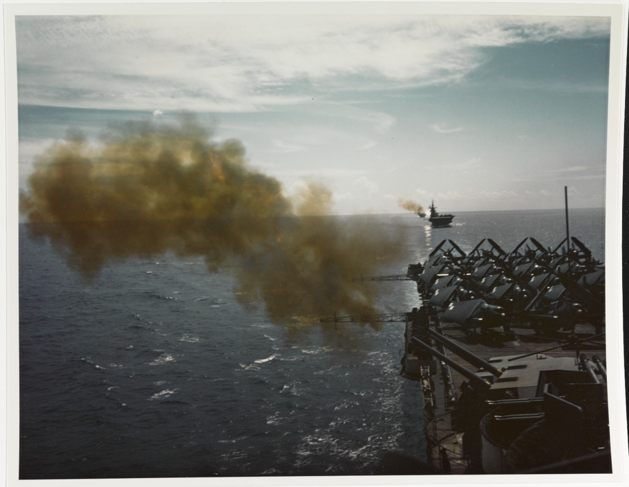 USS Hornet (CV-12) firing her starboard 5″ / 38 gun battery in a Western Pacific practice exercise, circa June 1945. The next ship astern, also firing, is USS Bon Homme Richard (CV-31). 80-G-K-5704 (color)