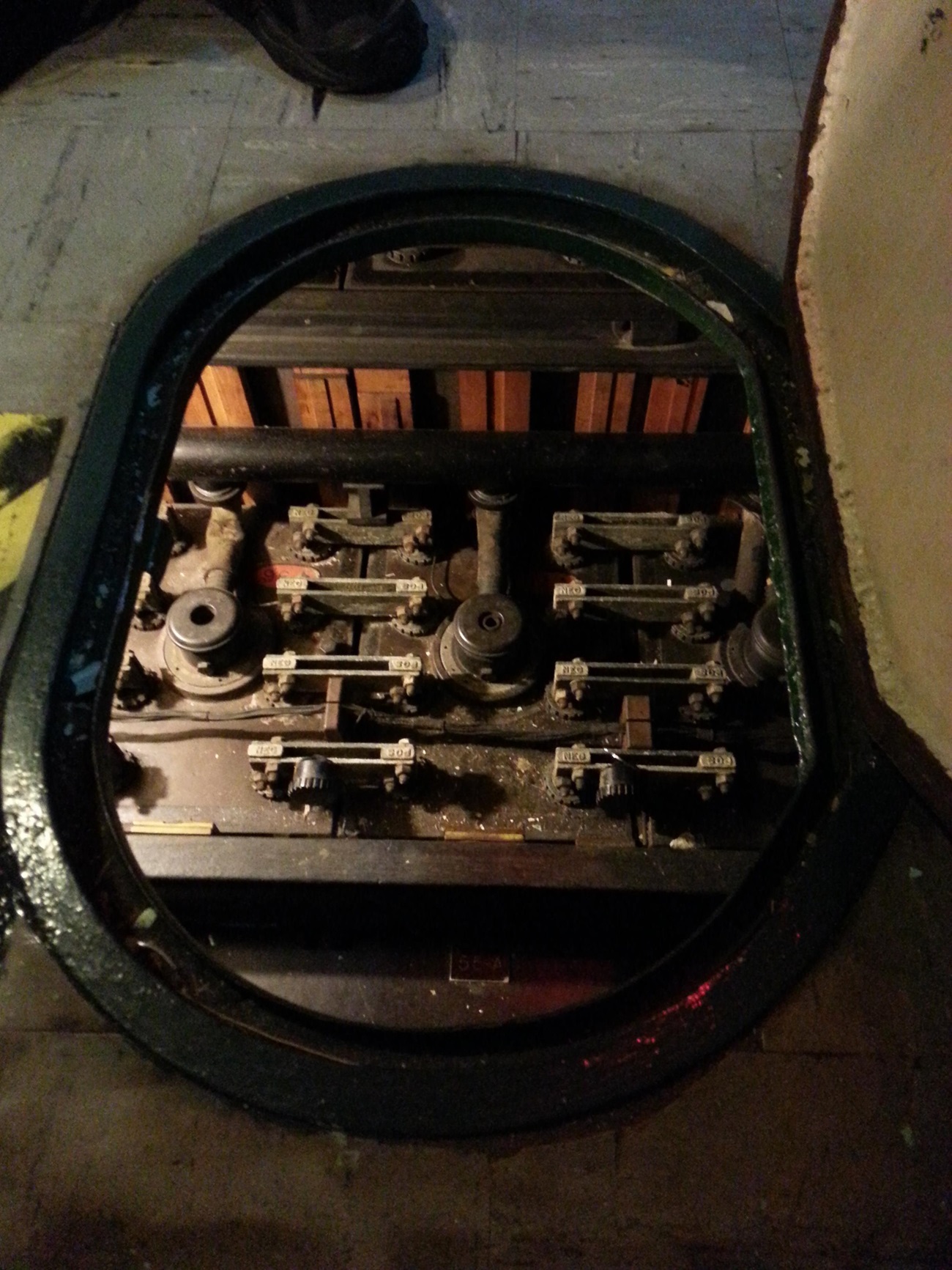View of some of the Sargo-type battery cells as seen through a floor hatch aboard museum ship, the former USS Ling (SS-297)
