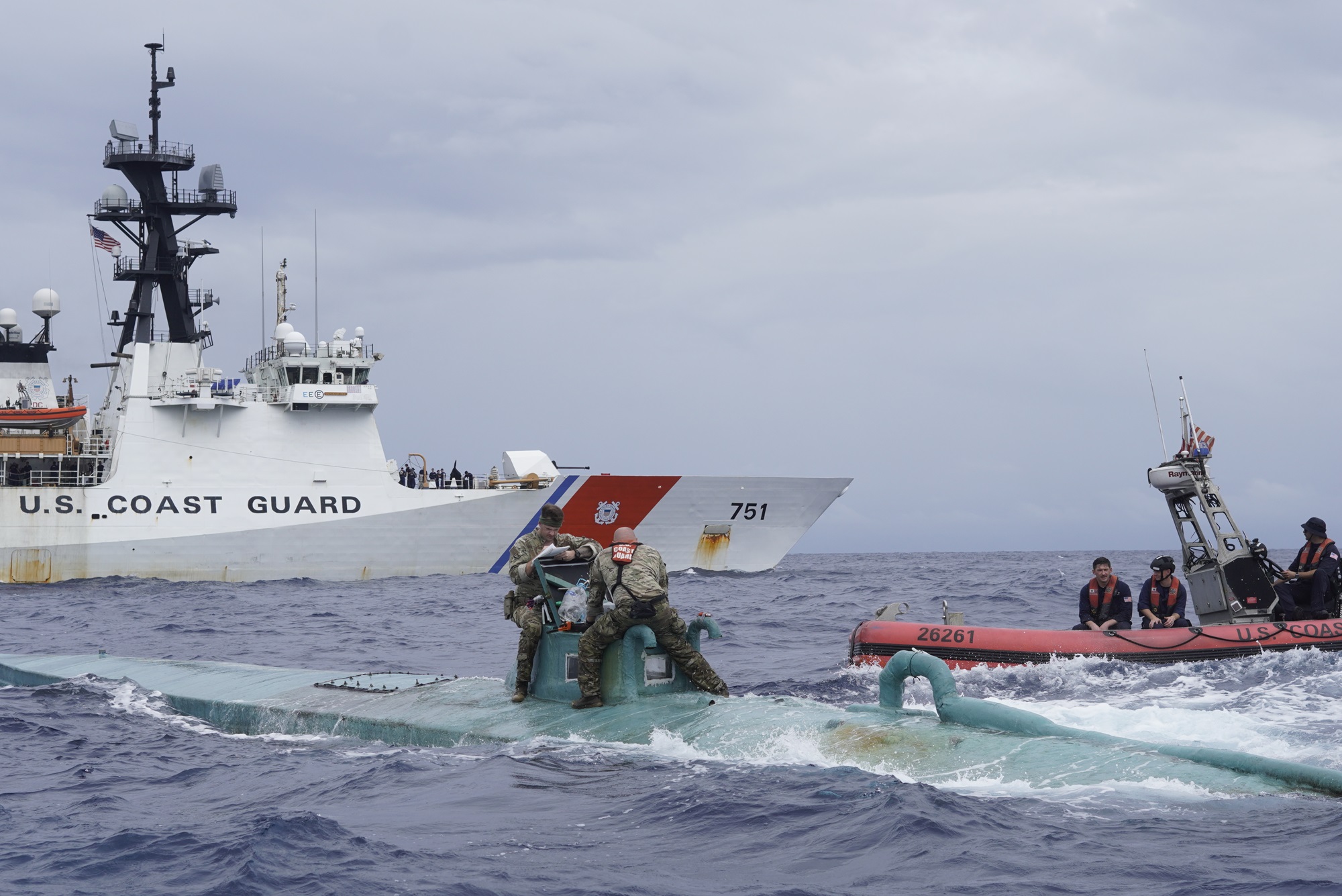 Members of the Coast Guard Cutter Waesche (WMSL-751) law enforcement boarding team inspect a self-propelled semi-submersible (SPSS) in international waters of the Eastern Pacific Ocean, Nov. 20, 2023. The interdiction of the SPSS yielded more than 5,500 pounds of cocaine. In November 2023, Waesche crewmembers seized approximately 18,219 pounds of cocaine, with an estimated street value of over $239 million, during four separate suspected drug smuggling vessel interdictions or events off the coasts of Mexico and Central and South America. (U.S. Coast Guard photo)